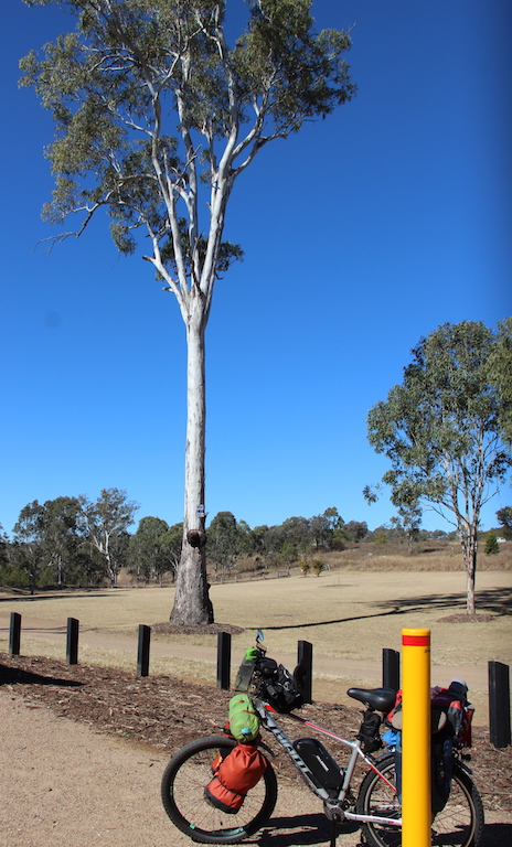 There were some bad washouts and rills and crossing them or running with them took a little skill with a loaded bike. However, we handled it and made it to the town of Blackbutt. Our camp was at the Show Society campground and even though it was crowded we found a good isolated spot next to a shed. Show societies are non-profit organisations and the best thing about them is the minimal fee charged, only $16 for the two of us and there was copious amounts of hot water to wash away the ills of the day’s rough ride.