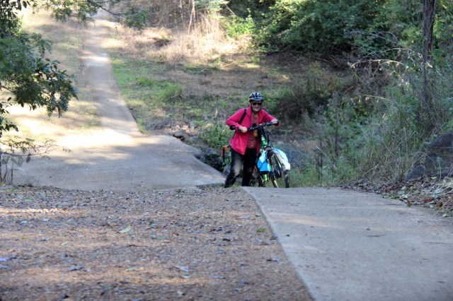 Fred taking Bev’s bike up the steep slope of a creek crossing.