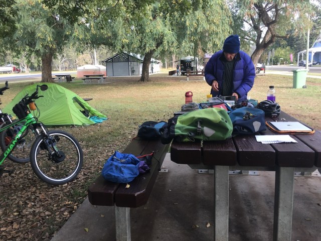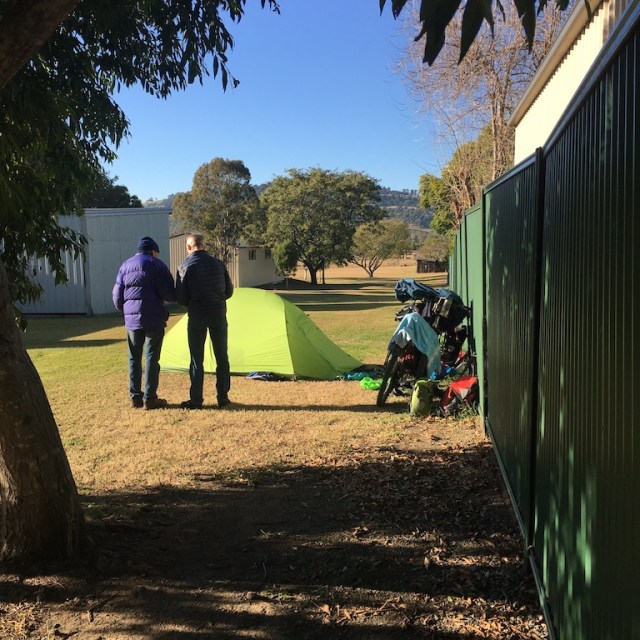 By mid afternoon we found ourselves in the Toogoolawah showground. Tent sites could be secured there for $20 a night. The showground was spacious so where to camp was the question. First, one has to determine where the sun will rise, especially on freezing mornings, then one wants to camp by a table otherwise it’s grovelling on the ground when preparing meals. At the site we chose there was a floodlight with a switch: bliss. It turned out we found a table right where the early morning sun would beam its warming rays.