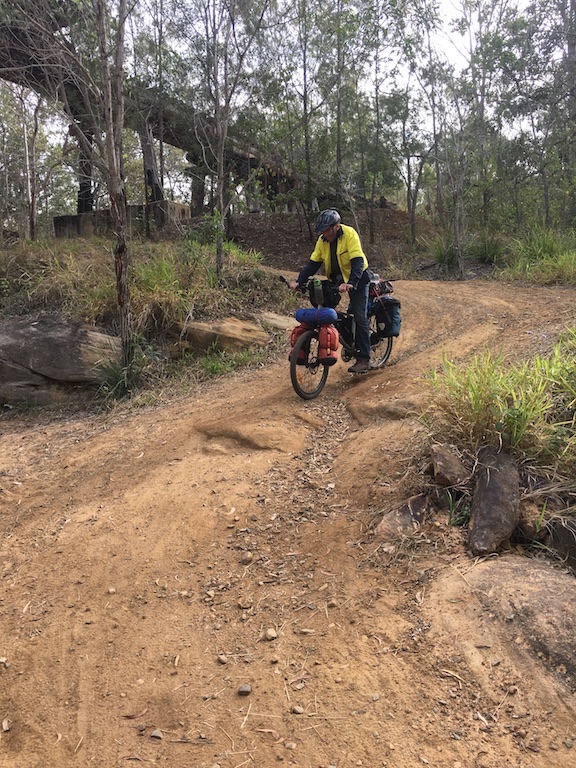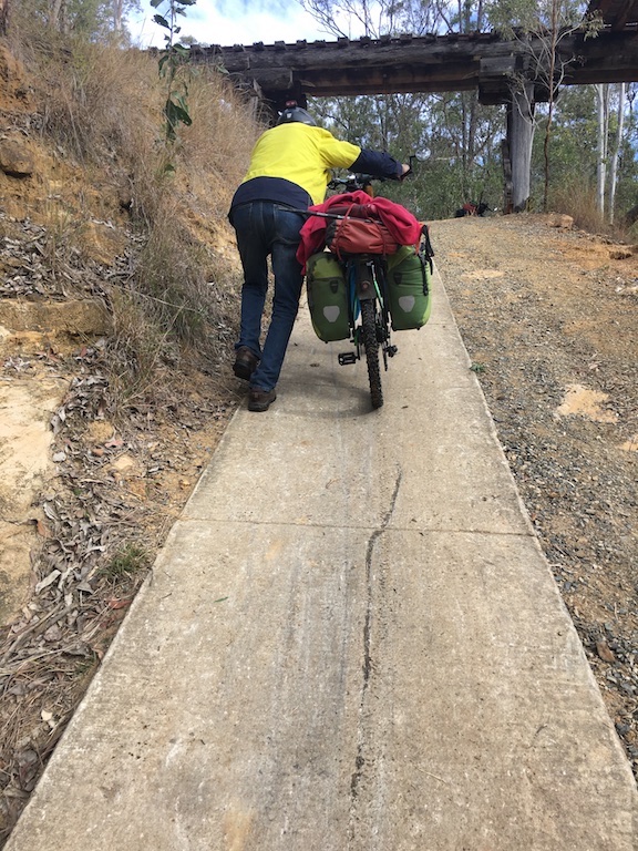 There is nothing guaranteed when it comes to the surface of the rail trail in the northern section, one minute you are on smooth compacted granite, then next on rough ballast. The idea is to keep moving and if you do you are more prone to staying upright. Albert Einstein was quoted as saying ‘Life is like riding a bicycle. To keep your balance, you must keep moving’. You were right, Albert. Staying upright is relative not only to the surface of the path but also to how much gear you are carrying and how low your centre of gravity is.