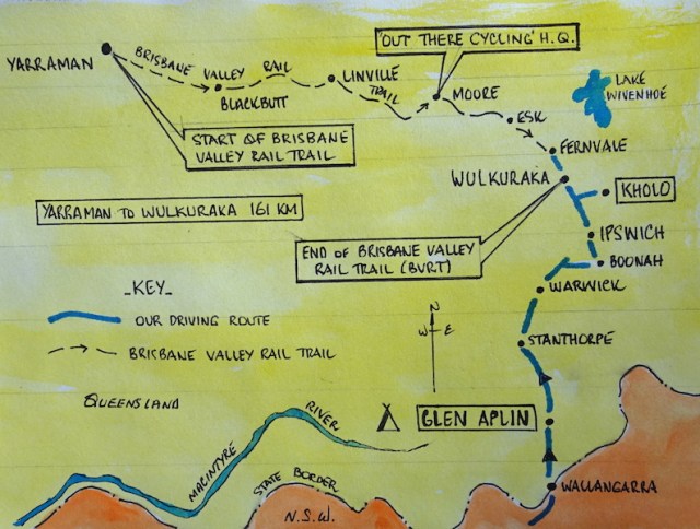 Map showing our route from Glen Aplin to the Ipswich region and the BVRT.