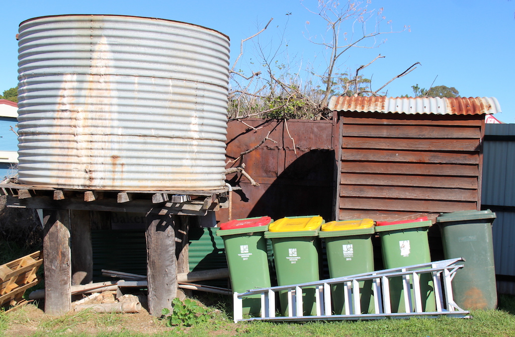 A dunny, a corrugated iron rainwater tank, wheelie bins and a ladder at the rear of the Yarraman Bakery.
