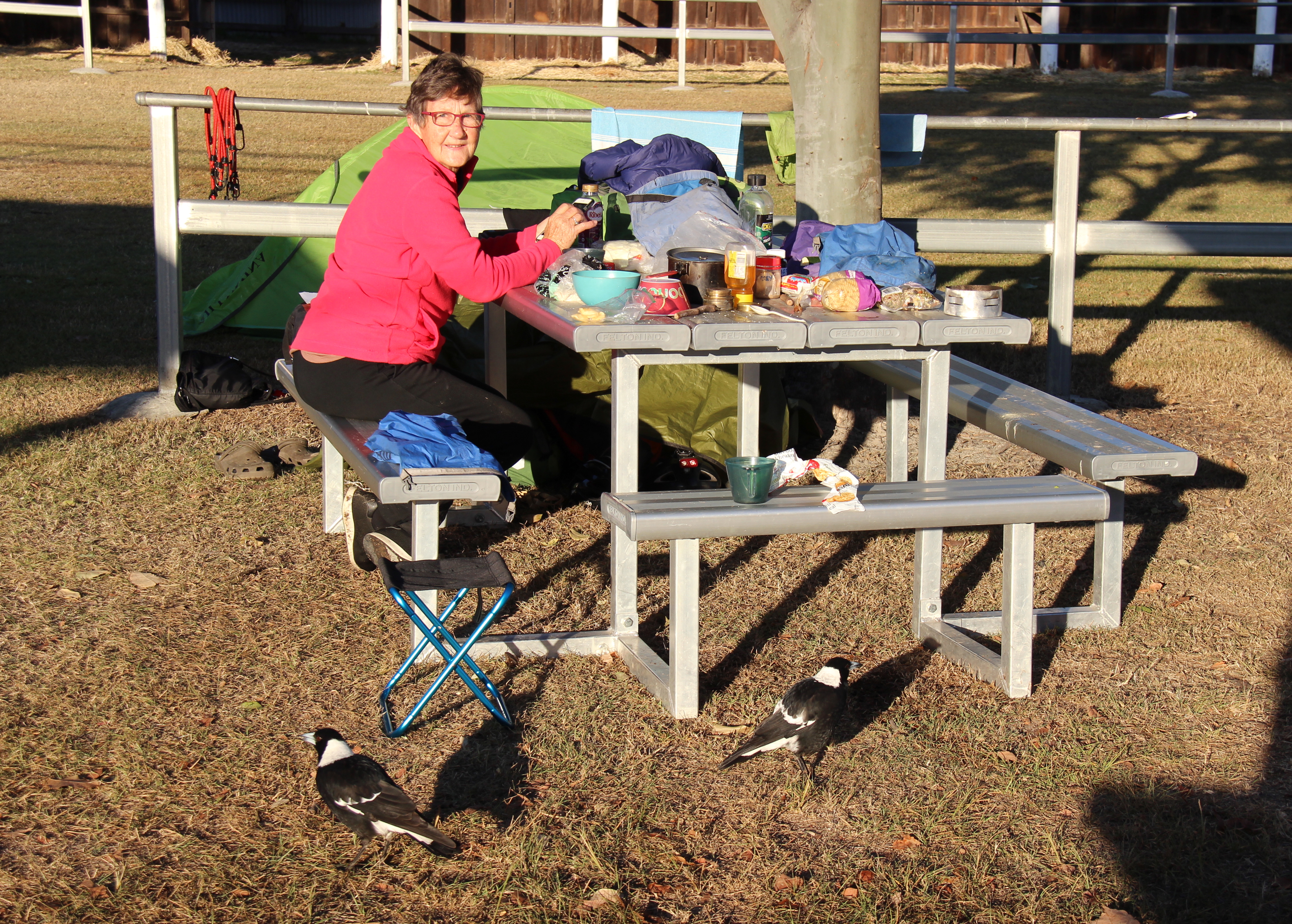 Communing with magpies at the Toogoolawah Showground camp.