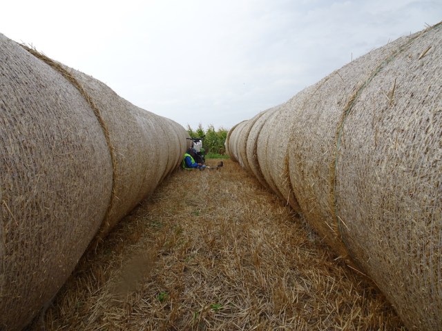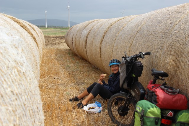 Lunchtime came just after the Roman ruins and the only place out of the wind was between a row of hay bales. This nook would have been a good place to camp. The bales were sufficiently spaced so we could have erected our tent between them. Reflecting on camping we decided it was too early to call an end to the day and we reluctantly resumed battle positions against the wind.