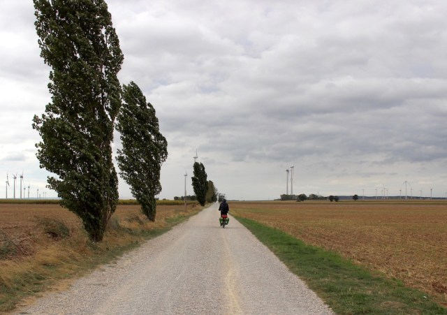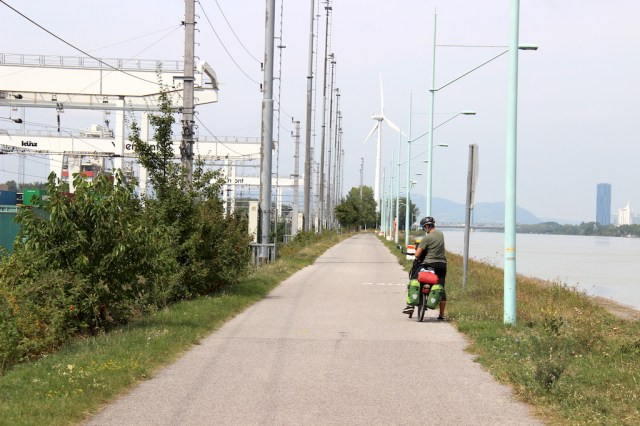 The absence of a ferry and a storm brewing meant there was no option but to backtrack and continue on the southern side of the river. We had to return up the steep hill we had come down earlier and look for an alternative route to Vienna. Fortunately, the route we chose was basically traffic free and near the Vienna International Airport the bike route became the Flughafen route which took us all around and through the airport, down to the river and along into Vienna.