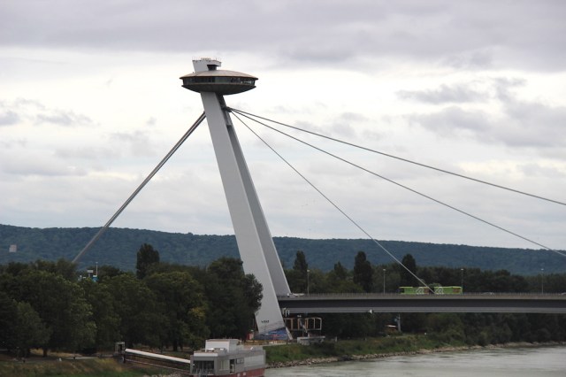 Bratislava’s bridge across the Danube. It is known as the UFO bridge because of the structure on the top which, serves as a restaurant.