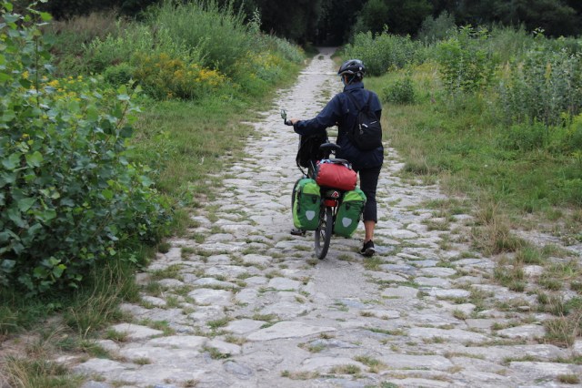 In some sections along the Danube there are two paths, either side of the river and because we were unsure which one to take we asked the waiter which of the two would be least windy. The south side was suggested as the northern path went across open wetlands and he thought it would be exposed more to the winds. It turned out the southern path was far from calm as in parts we rode along the top of a levee and were exposed to the full blast of the wind. There were times when the wind was not head-on but coming from the side and on a couple of occasions we were almost blown off the top of the levee. Regardless, we battled on, passing through Petronell-Carnuntum and took a reprieve in a set of Roman ruins. It’s hard to believe that where we rode Roman soldiers once marched. It was exciting to find such ancient ruins standing like sentinels in the surrounding farmland.