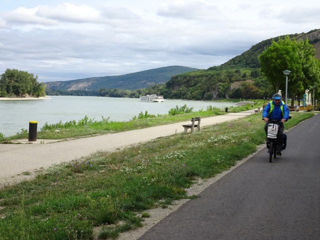 The next day’s ride was not without event. We took the downhill path from the village to the Danube where a passenger ferry takes cyclists across the river. The path was a rough and stony affair and led to the water’s edge where there was a sign indicating to telephone the number thereon and the ferry would come across and pick you up. Bev telephoned the number and a recorded message said the ferry was not running that day. But what kind of ferry was it? There was no jetty. Was it a barge that could be driven up on the beach? We will never know.