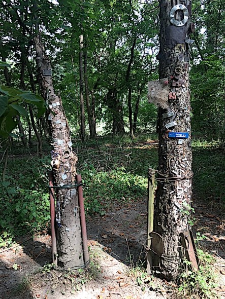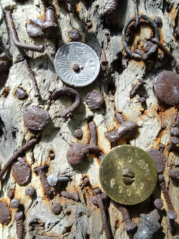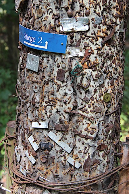On the outskirts of Vienna we took a narrow, overgrown path through the forest (the south-eastern end of the Prater Park) and it was along this path Bev decided to go bush and attend to a call of nature. To our surprise she came across two dead tree trunks, not just ordinary trees, they had hundreds of old nails and other pieces of assorted metal driven into them. The chance of her discovering these old trees was immeasurable.