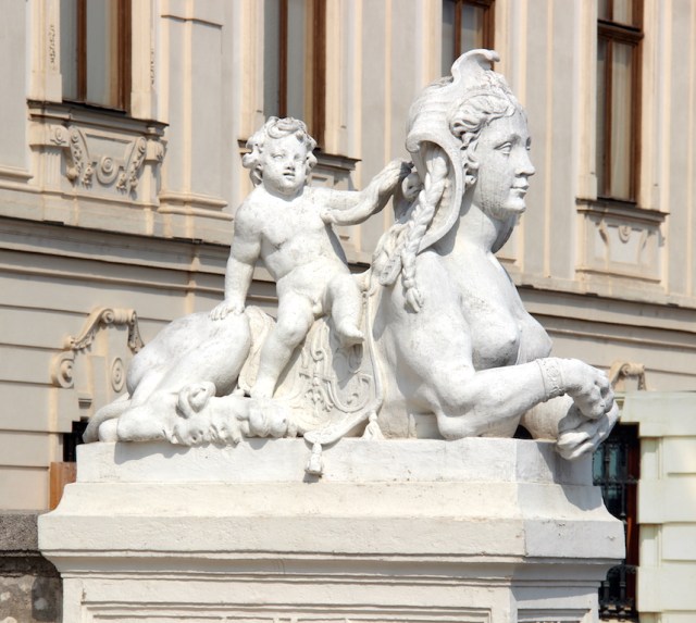 A sculpture such as the one above with a woman’s torso and an animal body is called a sphinx (or sphynx). A sphinx is a prominent mythological figure in past Greek and Egyptian culture; they were often regarded as a spiritual guardian. One could easily dismiss the Baroque sphinx at the entrance of the Upper Belvedere Palace as being put there for decorative purposes but I get a feeling a lot of discussion would have gone on about its location. The combination of half human and half animal creations indicated man/woman’s love of animals.
