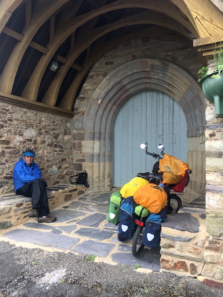 Sheltering from impending rain in the entrance of the Church of St Michel, Bruc sur Aff.