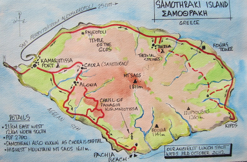 One of the many watercolour maps included in Odyssey Part 1. Samothraki Island, Greece.