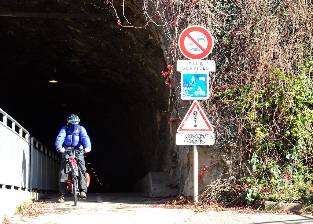 Emerging from a bike only tunnel along the Eurovelo 6 at Besancon France.